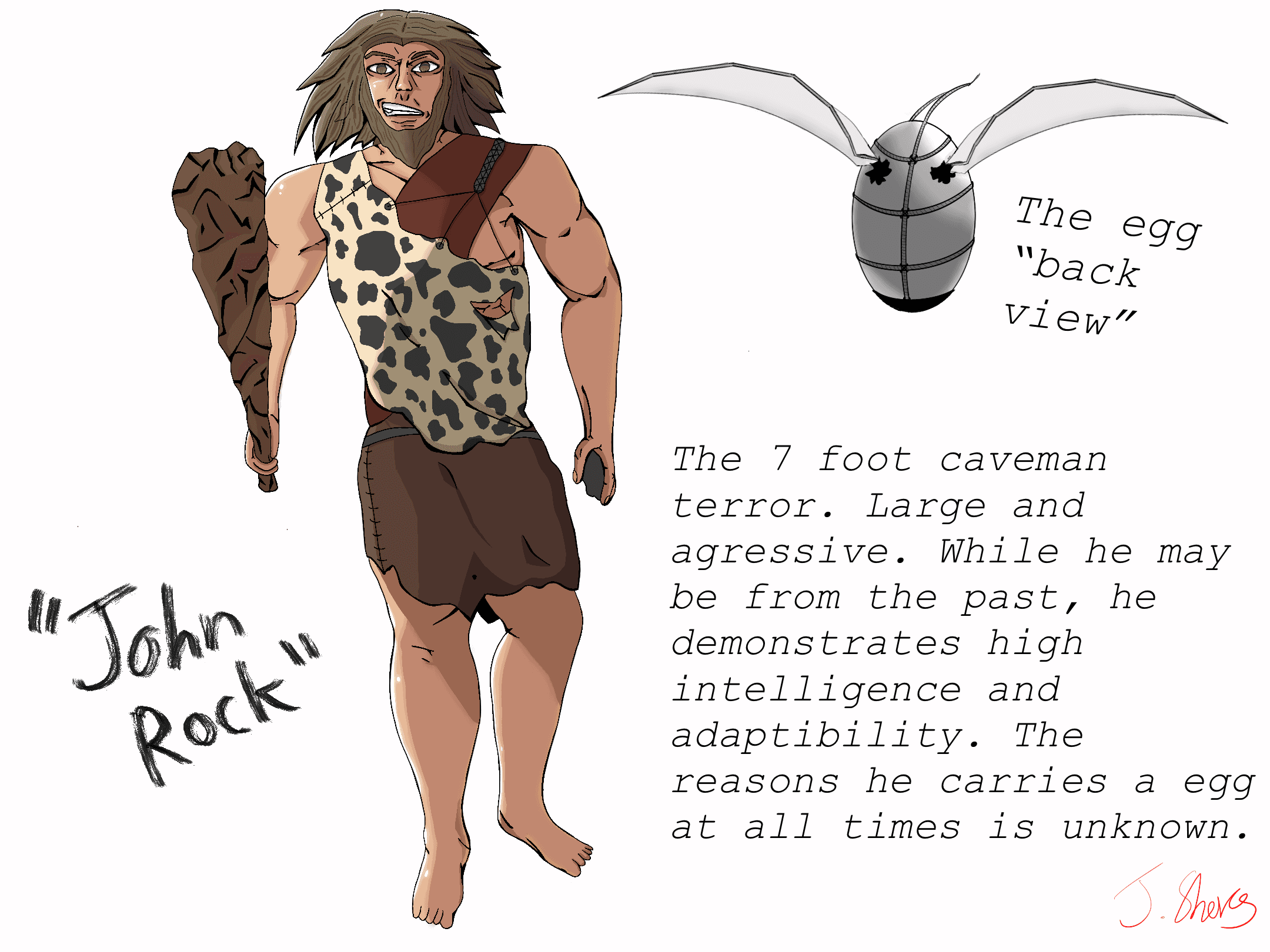 "John Rock". As explained in the picture, he is a naturally high intelligence caveman. Originally designed for a fighting game idea me and my friend had, he would be a heavy grappler with a bit of a more comedic yet hard hitting move set. The egg on his back would also be on him in the game and would give me moves/mobility options like a air glide. While also physically fighting with his large build and trusty club and rock. This also helped me see some aspects I could use of improvement, such as anatomy, muscle definition, hair and face proportions.